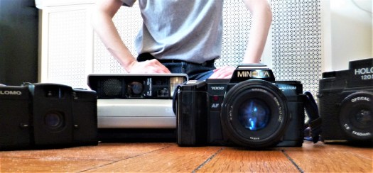 From left to right: a Lomo (there’s a whole society of people crazy about the Lomo, but mostly it just gives me agita), a Polaroid Spectra (sigh), a Minolta Maxxum 7000, and, for medium-format film, a Holga. Most of the photographs on this site were taken with the Minolta. Why this camera? Because nobody ever tried to sell me any other kind for rent money. But you can get one now for about thirty dollars, and I still recommend it, even if it’s heavy and noisy. Not so great for capturing solemn moments in church, good if your band wants to launch into “Girls on Film.”